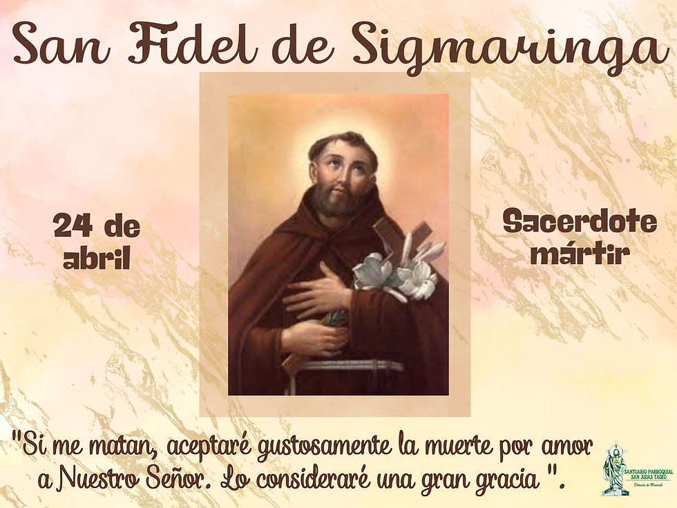 San Fidel de Sigmaringa, presbítero y mártir, el cual, siendo abogado, decidió entrar en la Orden de los Hermanos Menores Capuchinos, llevando una vida observante de vigilias y oraciones. Asiduo en la predicación de la Palabra de Dios, fue enviado a la región de Recia para consolidar la verdadera doctrina, y en Sevis, de Suiza, fue martirizado por los herejes a causa de la fe católica († 1622).